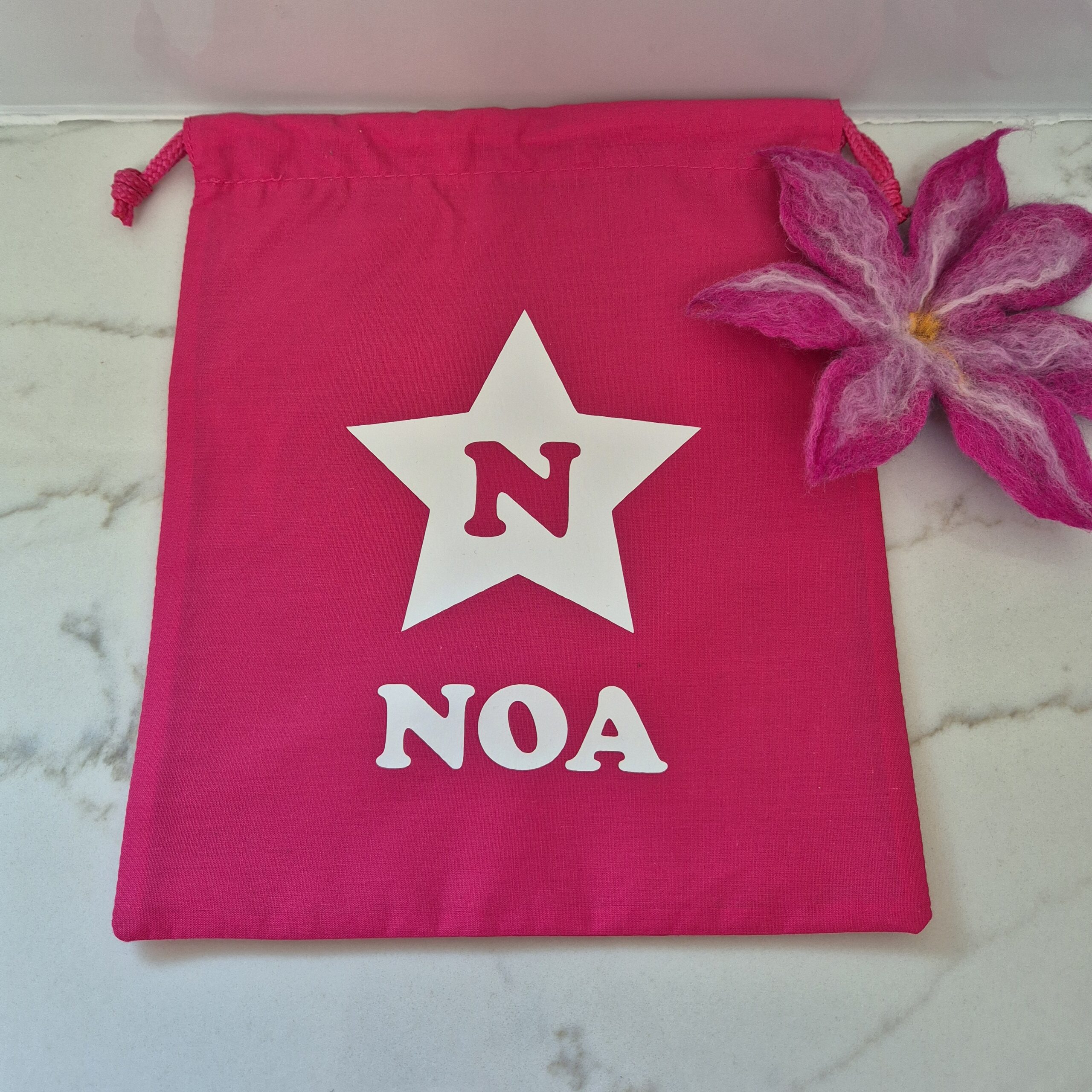 A perfect drawstring bag for your child’s bits and bobs, spare change of clothes, personal belongings or many other purposes. Personalised with your name and initial. Choose from a star or a heart.